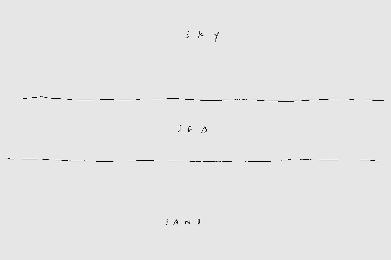I am competitive, and since I knew I could not compete with Dan’s drawing ability, I understood that to be happy, I had to invent a creative way around the problem of making things look beautiful. So while Dan was drawing perfect renderings of the beach, I drew two straight lines on a page, dividing it into thirds. I wrote “sky” in the top third, “sea” in the second, and “sand” in the bottom third.
