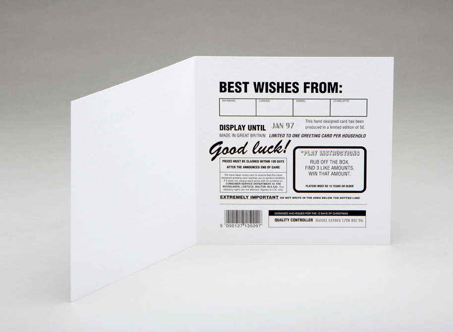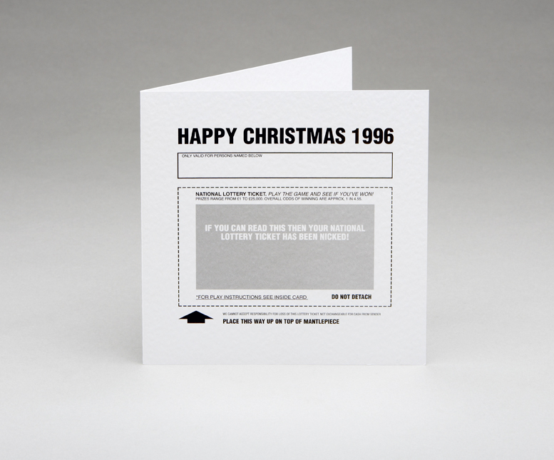 The first project I ever had printed was this family Christmas card. I designed it, and my Dad paid to have it printed. It was made in 1996, the same year as the first Government’s National Lottery Scratch Card, which I stapled to the front of each card, giving the recipient the chance of winning one hundred thousand pounds. I am not a gambler but liked the idea of paying one pound to give a friend the chance of winning one hundred thousand. A few people won ten pounds, and Dorothy Whalley mistakenly threw the card away thinking it was junk mail.