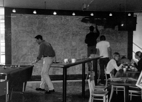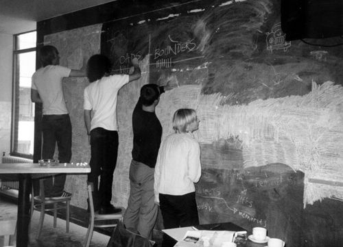 In the coffee bar at the Royal College of Art a large blackboard covers one wall, which is used to write down pool game scores, jokes, messages, doodles, and graffiti. My friend Martin Anderson and I decided to color the entire blackboard white using regular sticks of chalk. It took us the entire day, with the help of a few friends during their coffee breaks.