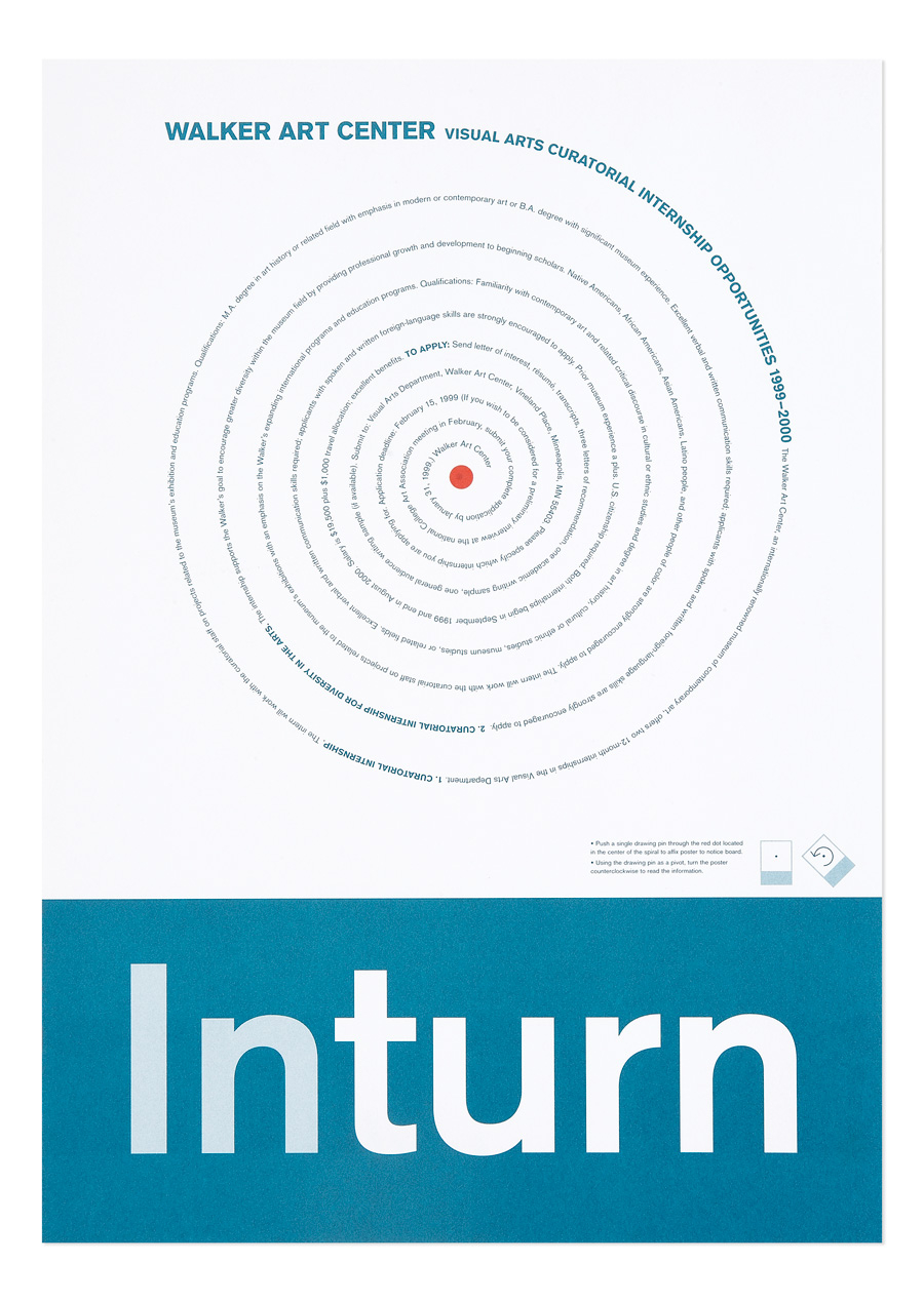 A poster to advertise for three visual arts interns. The poster must be pinned to the wall with a push pin in the center of the spiral. The viewer has to turn the poster to read the information. The last word in the spiral is ‘Center’. A red dot was hand applied to the center of the spiral on each poster as a locating point for the push pin.