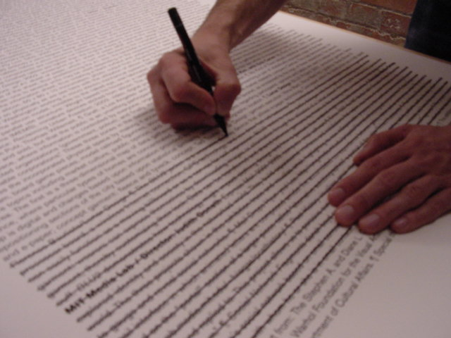 All the information text for the exhibition; title, introduction, artwork captions etc. is typeset to fill the page and printed on a single side of an A1 sheet. The sheet is exhibited alongside each work in the gallery. Only the information relevant to the work next to which it is placed is legible, all the other information has been crossed out by hand.
