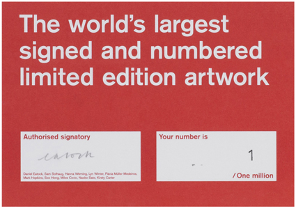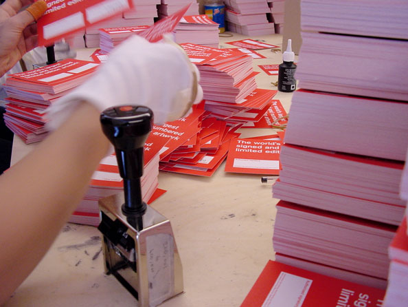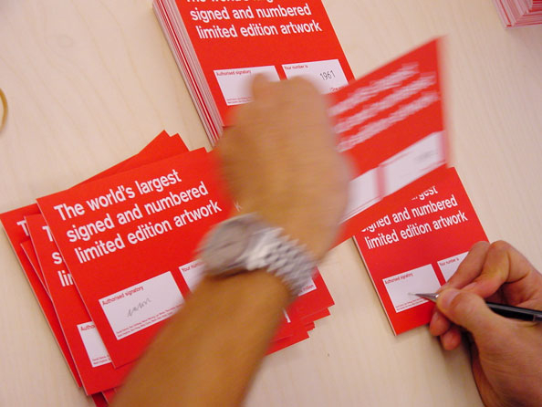 The work took 14 days to produce. 10 people each signed 100,000 postcards, 8 people numbered them with stamping machines, a project coordinator orchestrated the complex task and confirmed/witnessed that each card was signed, numbered and packaged in sequence. A total of 419 A4 boxes each containing 2400 cards (14 pallets) were signed and numbered. Each signatory had to sign a card every 5 seconds, work a ten hour day and only stop for 30 minutes in order to keep on schedule. The artworks were distributed by Boomerang Postcards, and where available for free from postcards racks in galleries, coffee bars, restaurants, cinemas etc. all over England. This project was submitted to Guinness World Records, January 2003. It was not accepted as it was an unrecognised category. The work was funded by Channel 4 Television, and coincided with The Art Show a program about contemporary art and culture. Sean Rogg made a film titled World’s largest signed and numbered limited edition artwork that documents the project.