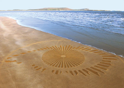 The Big Brother sand drawing was made on the beach at Cefn Sidan, Pembrey Court Park, Carmarenthenshire, Wales. It was sixty-five meters wide and took a crew of six people over six hours to construct. The window between high and low tide left only eight hours to build and photograph the drawing. The darker patterns in the wet sand were created by removing dry areas of sand.