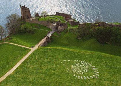 The Big Brother stone sculpture, constructed at Urquhart Castle, Loch Ness, Inverness, Scotland, with permission by Historic Scotland, took a crew of ten people about ten hours to complete. Approximately fifteen tons of limestone from a local quarry were delivered to the site, and the eye was visible for forty-eight hours before it was removed by the crew.