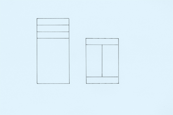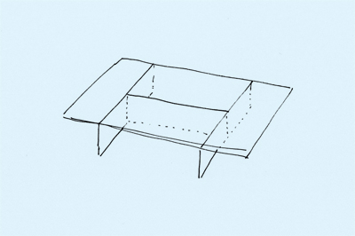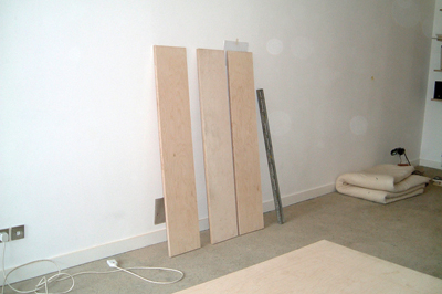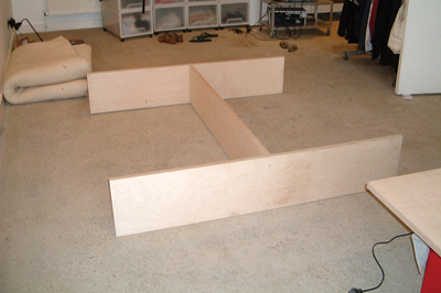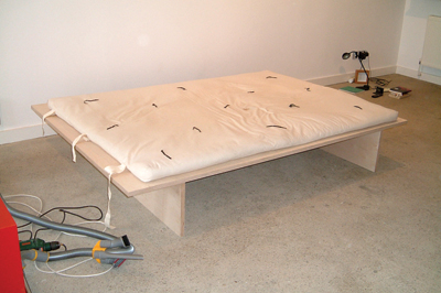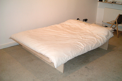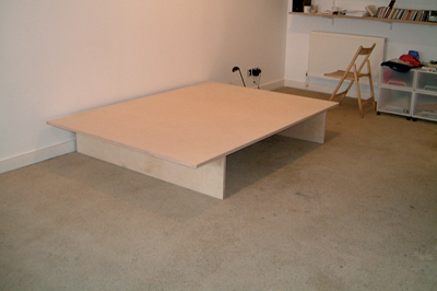 I bought a five-by-ten-foot sheet of birch plywood for a tabletop in my studio. After using it for a week, I decided that it was too large for my space, so I stood it upright resting against the wall. Lying on my futon on my studio floor, I mentally guesstimated that the sheet could be transformed into a bed base with just three saw cuts. An IKEA futon measures five by seven feet. After cutting three one-by-five-foot pieces from the sheet to form the H-shaped base, I was left with an economical one-foot-high bed base on which the five-by-seven-foot top rested with an overhang of one foot at both ends, accommodating the futon exactly.