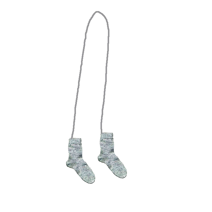 A string connecting a pair of socks goes up one trouser leg and down the other in reference to children’s mittens