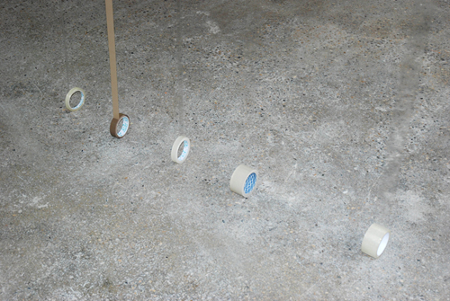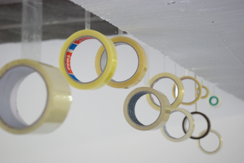 11 complete rolls of adhesive tape stuck to the celling beam of the gallery. For the duration of the opening the tapes gently fall to the gallery floor. The properties of the tape, weight verses strength of adhesive, determine the rate at which the tapes fall.