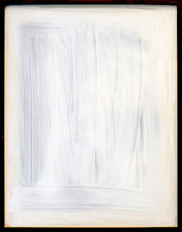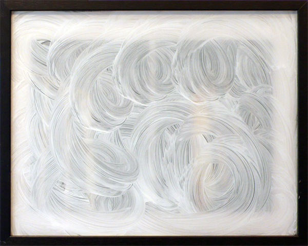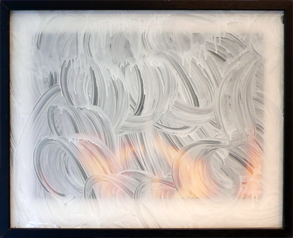 Unwanted framed pictures from people’s homes temporarily loaned to the gallery for the duration of the show. The glass is carefully removed and white wash applied to the inside surface. At the end of the show the frames are returned to their owners with the original pictures obscured.