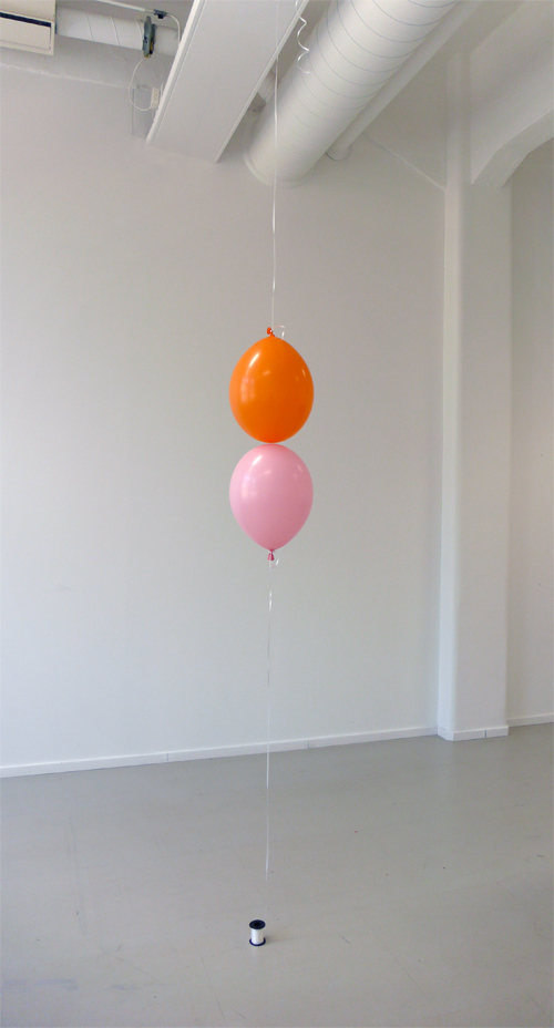 One coloured balloon (filled with a breath) suspended from the ceiling from white ribbon, a second balloon (filled with helium) fixed to the floor floating up on a white ribbon. The two balloons gently touch each other at approximately head height.
