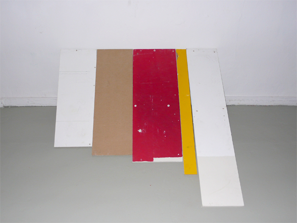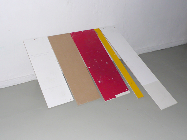 Five discarded pieces of wood salvaged from the galleries waste bin, leaned against the gallery wall sequenced in order of height. The shortest plank determines the horizon that the top edges of the remaining planks are aligned, the longer the plank the shallower the incline and the further the bottom edge projects from the wall.