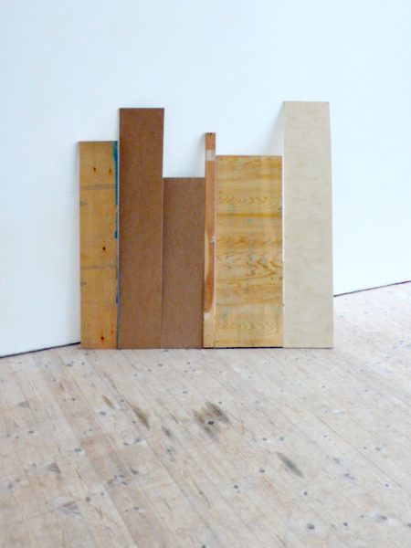 A haphazardly placed plank, found leaning against the gallery wall during installation, forms a guide from which other off cuts are arranged in the same manner with their bottom edges aligned.
