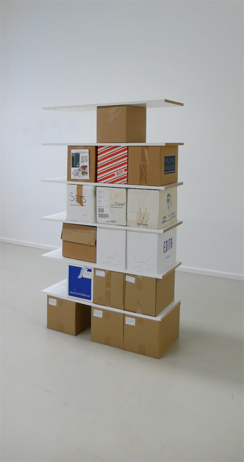 A gallery storage cupboard, shelving and contents, relocated and reconfigured in the gallery