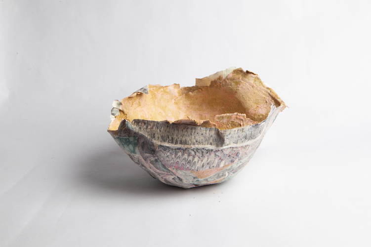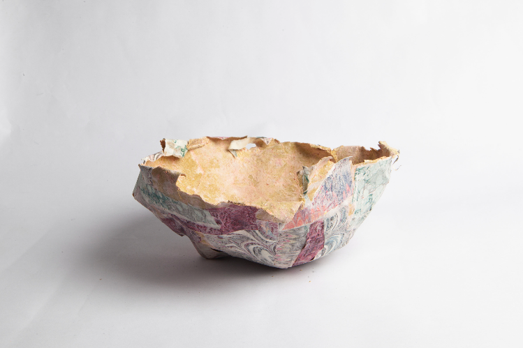 Venetian carnival masks are used as moulds, two layers of paper mâché, the first layer consisting of table mats sourced from Venetian restaurants, the second of hand printed marbled paper produced by the oldest shop in Venice. Both materials fixed using a bonding paste mixed from Aperol and 00 fine flour.
