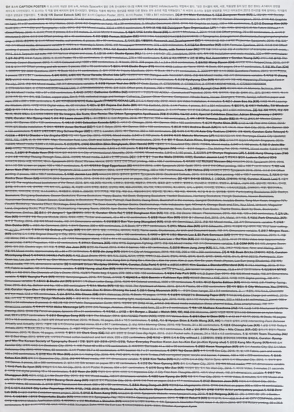 Daniel Eatock's Caption Poster shows one strategically adaptable example not in the language of fine art but in the context of graphic design, where a graphic designer steps inside the white cube. He collected all of the Typojanchi participant artist’s information including names, titles, materials, sizes and made one poster with them. He then crossed out all of the other information except for his own caption information. Therefore, this project as the title implies itself, is a poster as well as a caption of the work.
