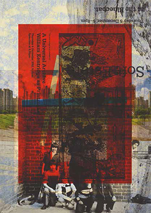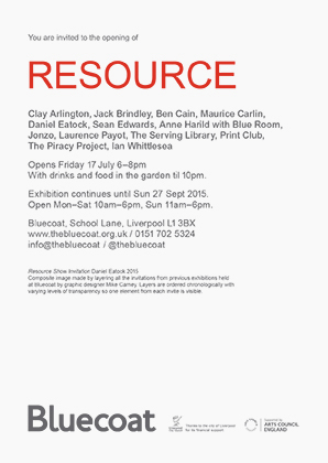 Composite image made by layering all the invitations from previous exhibitions held at Bluecoat by graphic designer Mike Carney. Layers are ordered chronologically with varying levels of transparency so one element from each invite is visible.