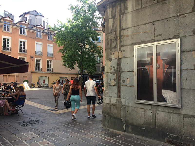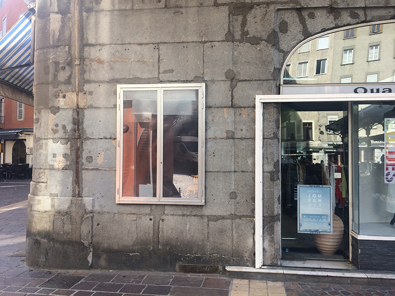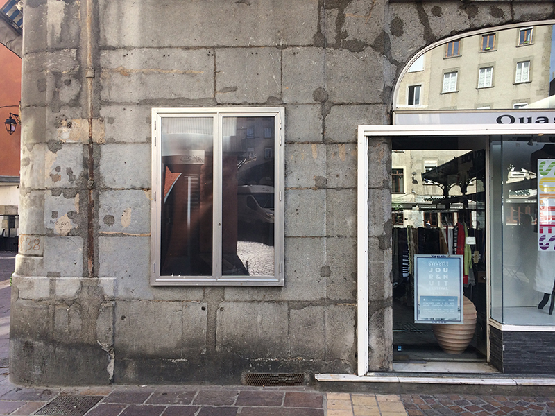 Galerie SHOWCASE is a display case located on a wall between Place aux Herbes and Place Claveyson in Grenoble France. Exhibited is a photograph taken of the refection in the cases glass of the surrounding environment. The work is the overlap of captured reflection and actual reflection as the two collide and form a visual echo that fuses into one.