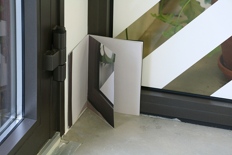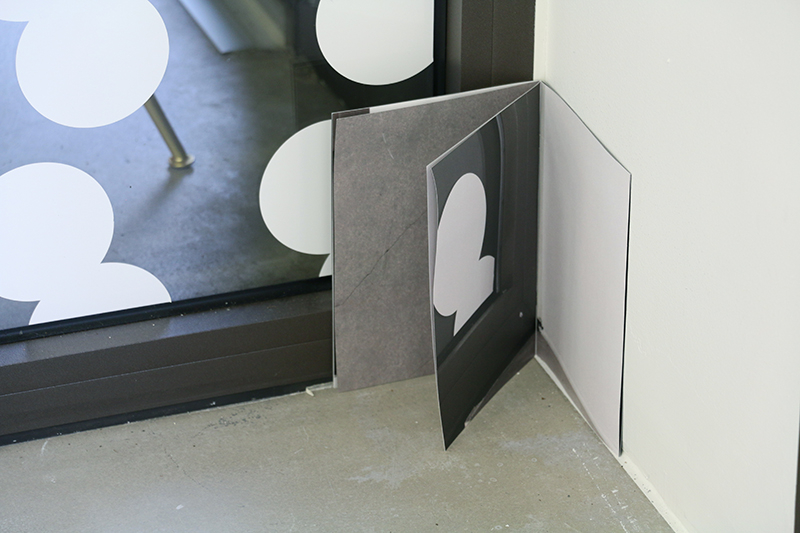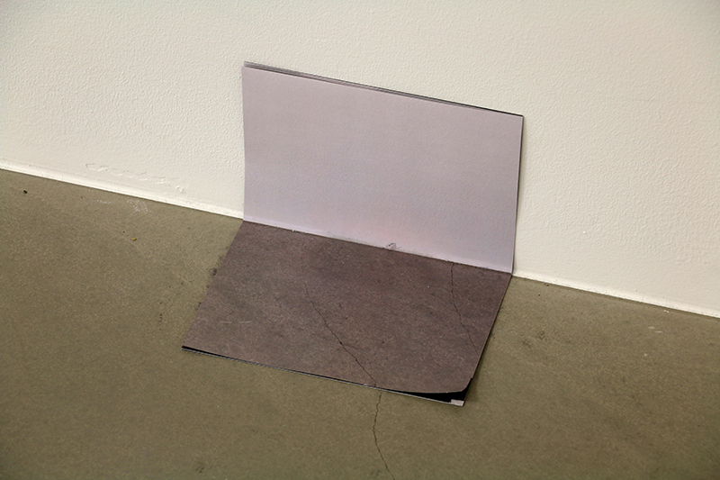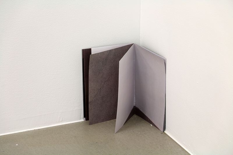 Four photographs of corners from within the exhibition space, printed actual size in a book. Opening the book renders a two dimensional plane (photograph) into a three dimensional space (two walls meeting in the binding of this book). The book is installed within the exhibition, each spread open ninety degrees, matching the photograph with the actual space it depicts.