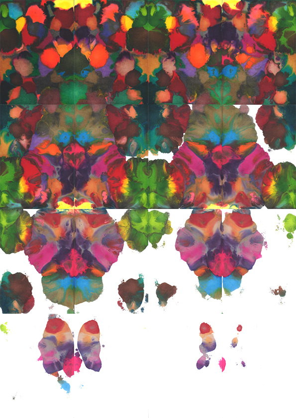 Winsor & Newton pens rested nib-down on a set of 16 sheets of A4 blotting paper. The printed sheets are then flipped, rotated and arranged in a four-by-four grid revealing symmetrical reflections.