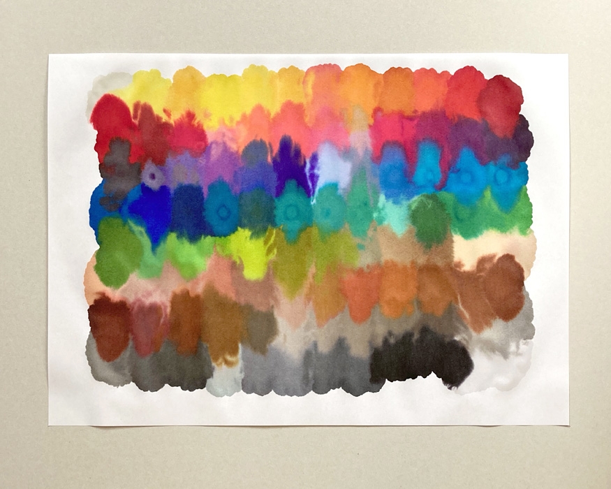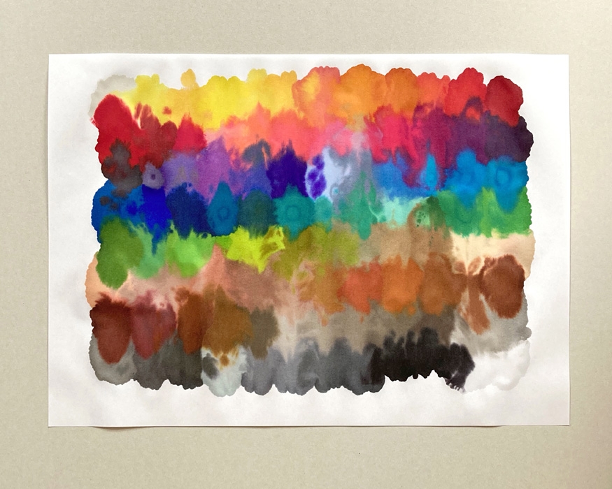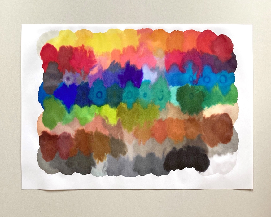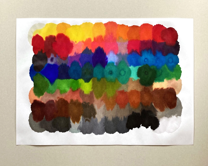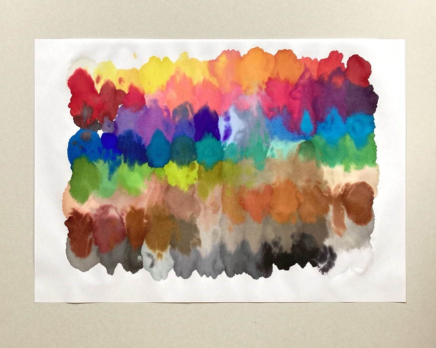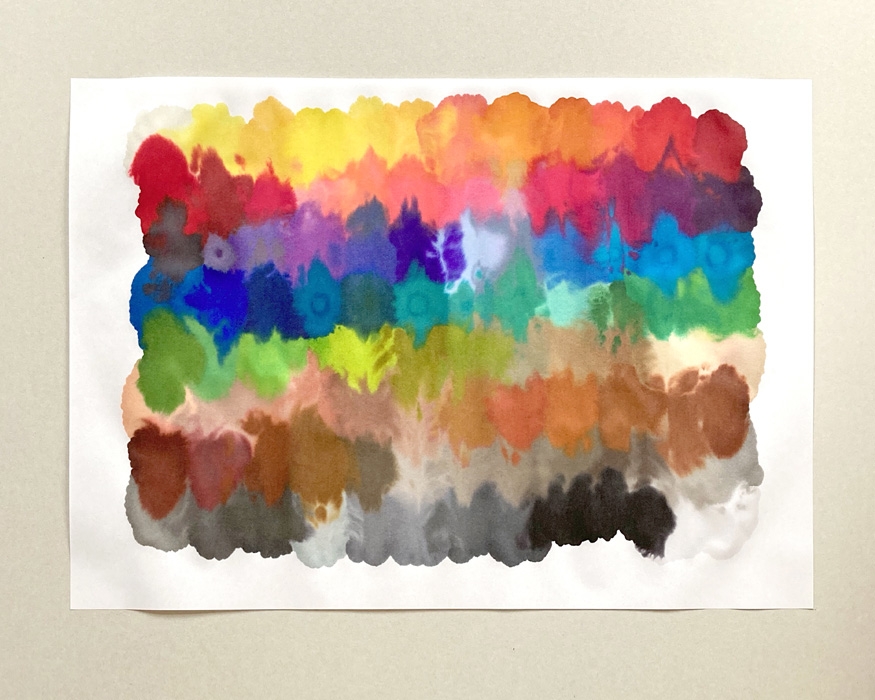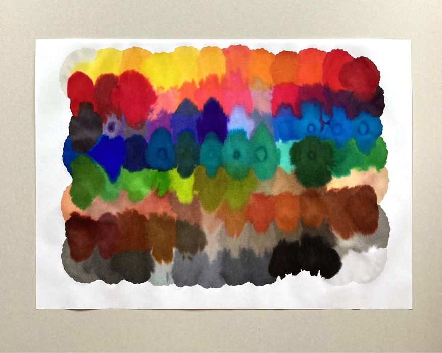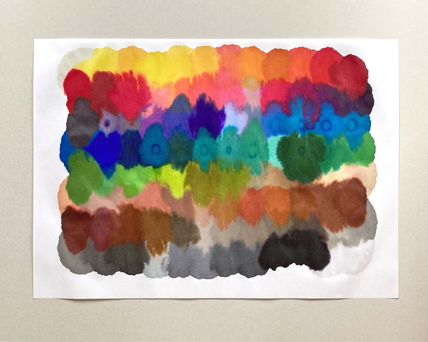 A new edition of 25 ‘unique’ prints made using the Winsor & Newton ProMarker Extended Collection of 96 colours arranged in the manufactures chart. The marker pens were left standing upright in a custom jig, with their nibs resting on the top layer of a stack of A2 paper for 96 hours. Slowly the ink seeped through 25 sheets creating an edition of related prints, each unique. Signed and numbered. Assigned in sequence.