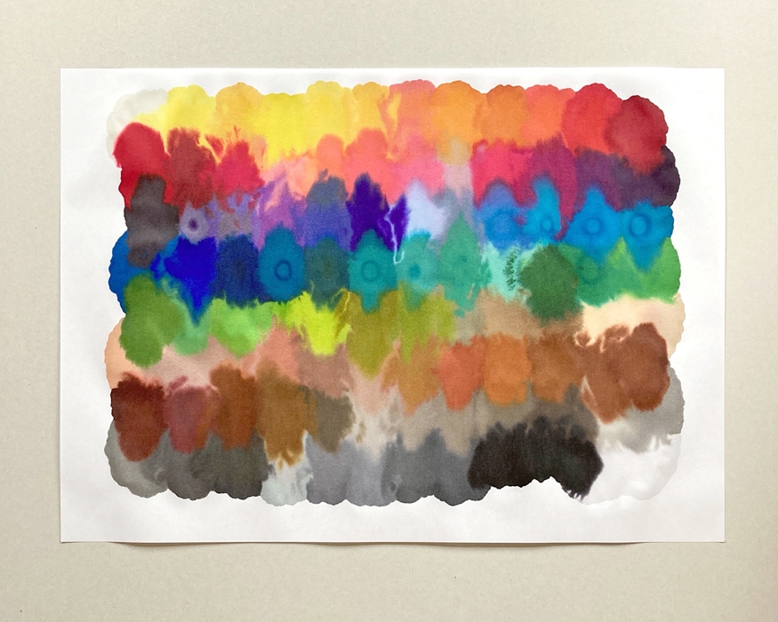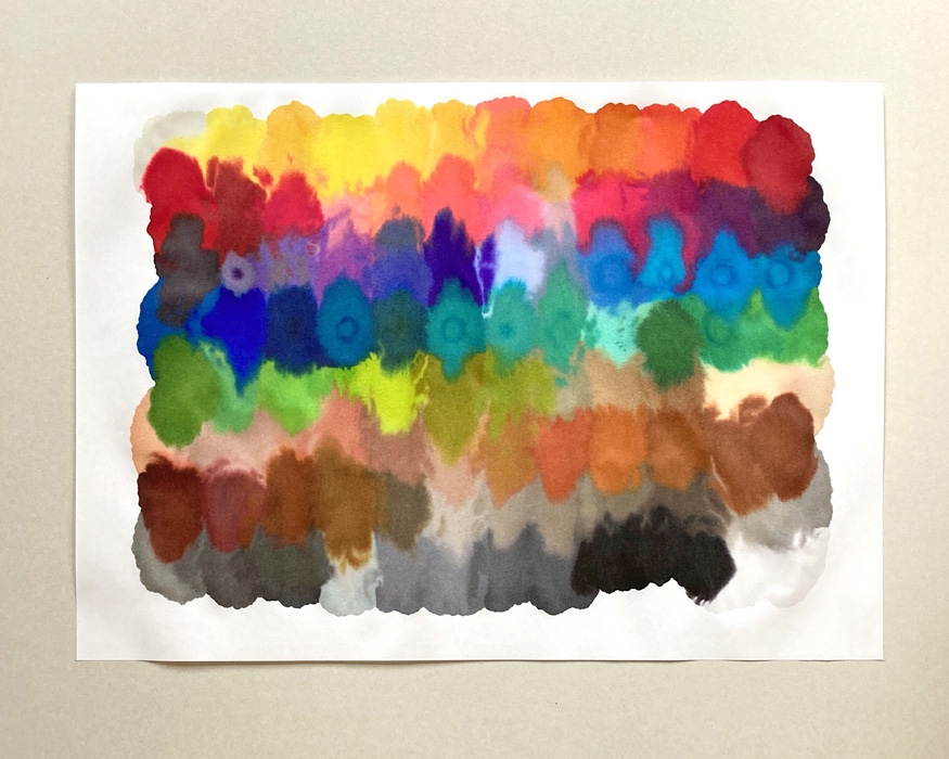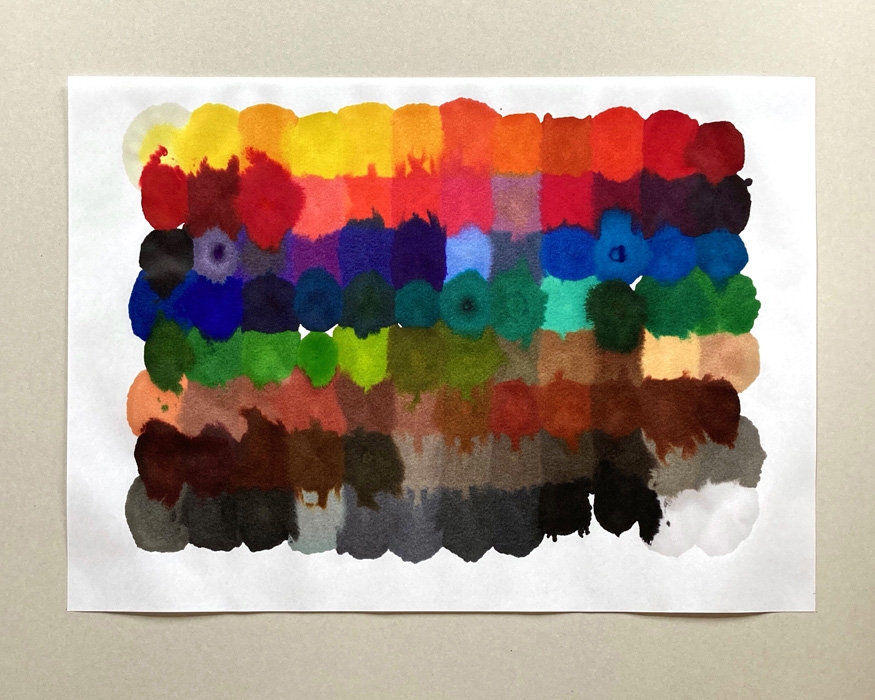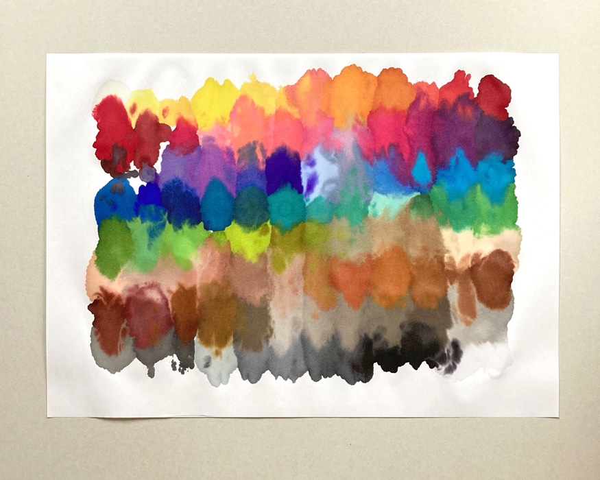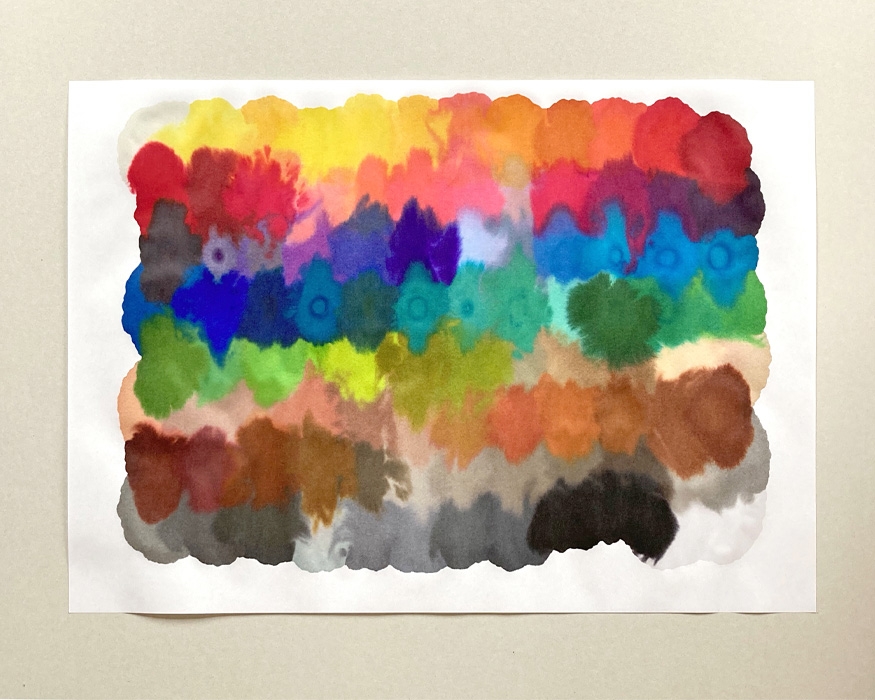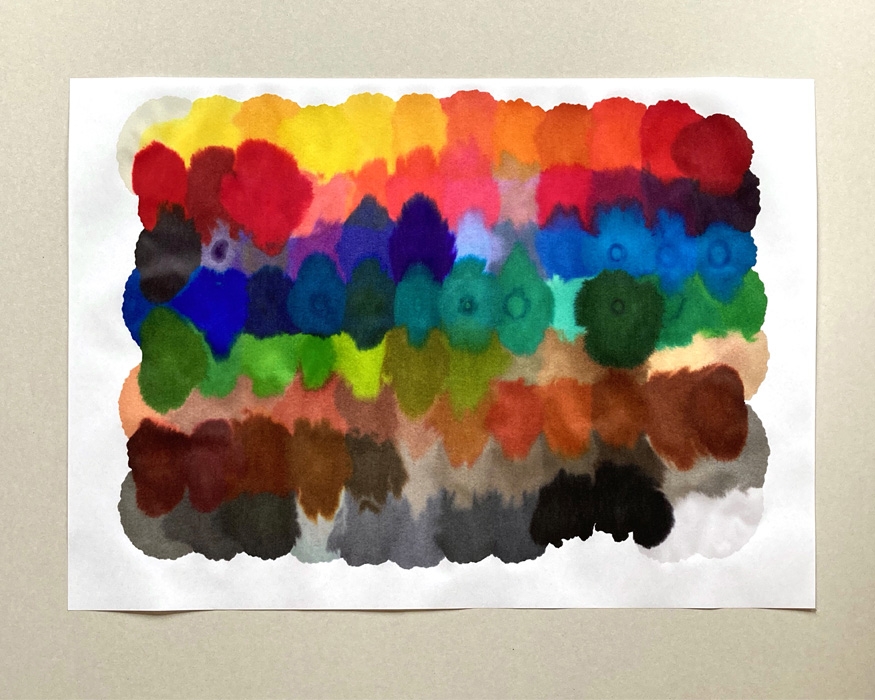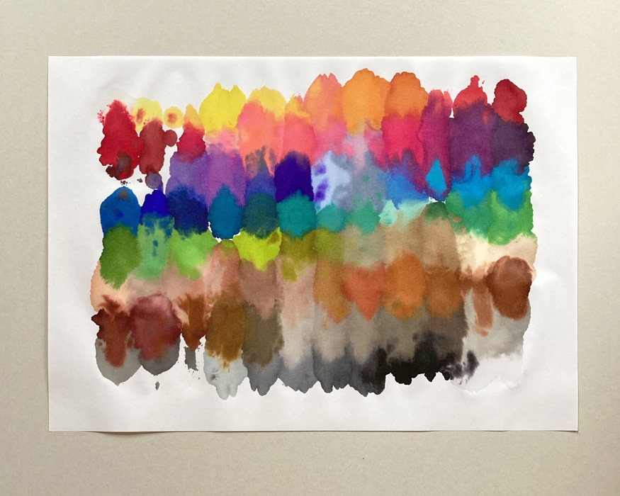 A new edition of 25 ‘unique’ prints made using the Winsor & Newton ProMarker Extended Collection of 96 colours arranged in the manufactures chart. The marker pens were left standing upright in a custom jig, with their nibs resting on the top layer of a stack of A2 paper for 96 hours. Slowly the ink seeped through 25 sheets creating an edition of related prints, each unique. Signed and numbered. Assigned in sequence.