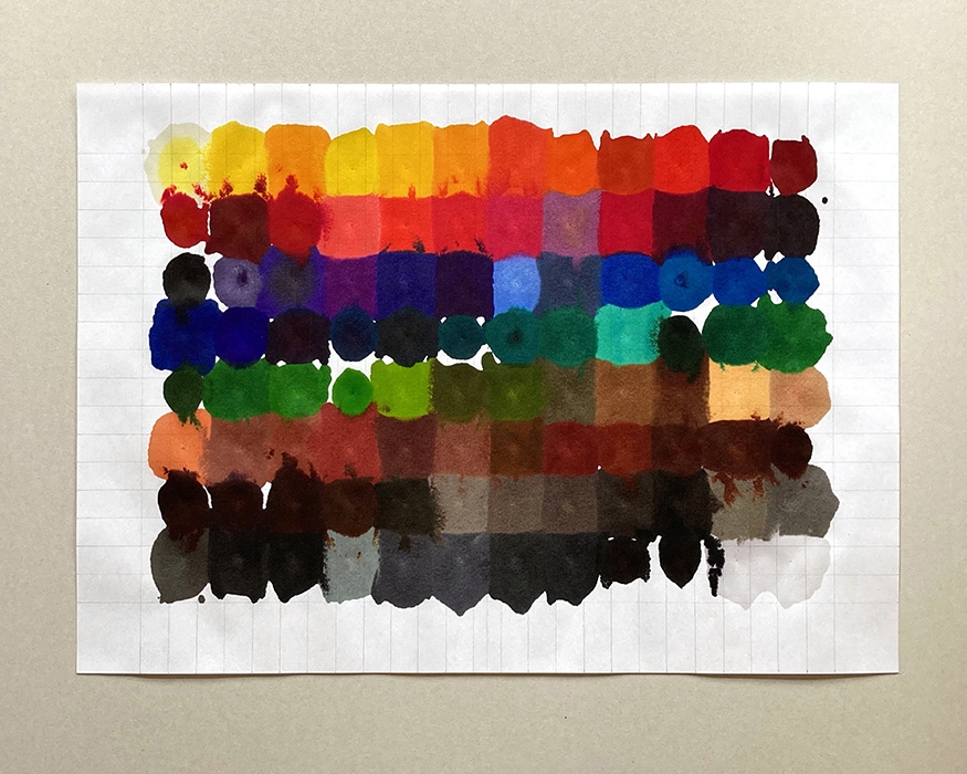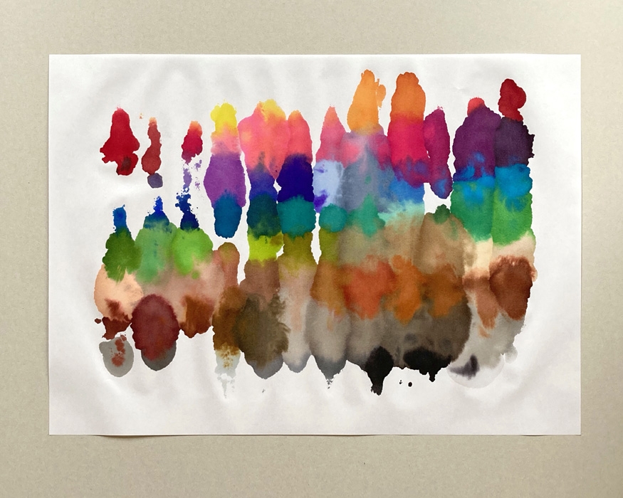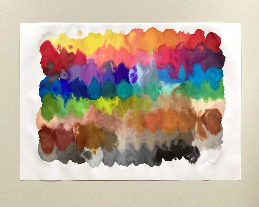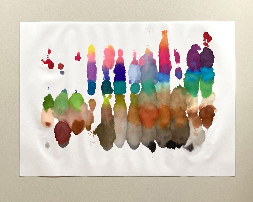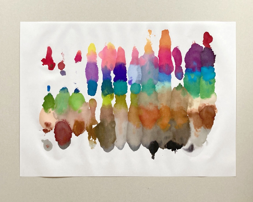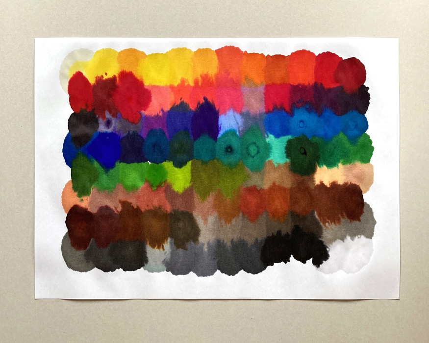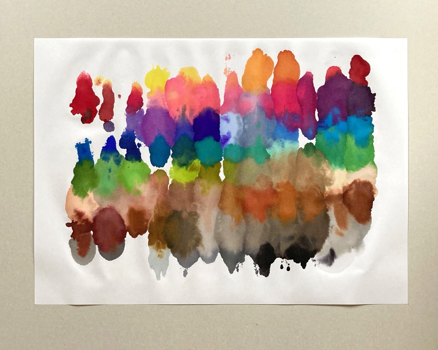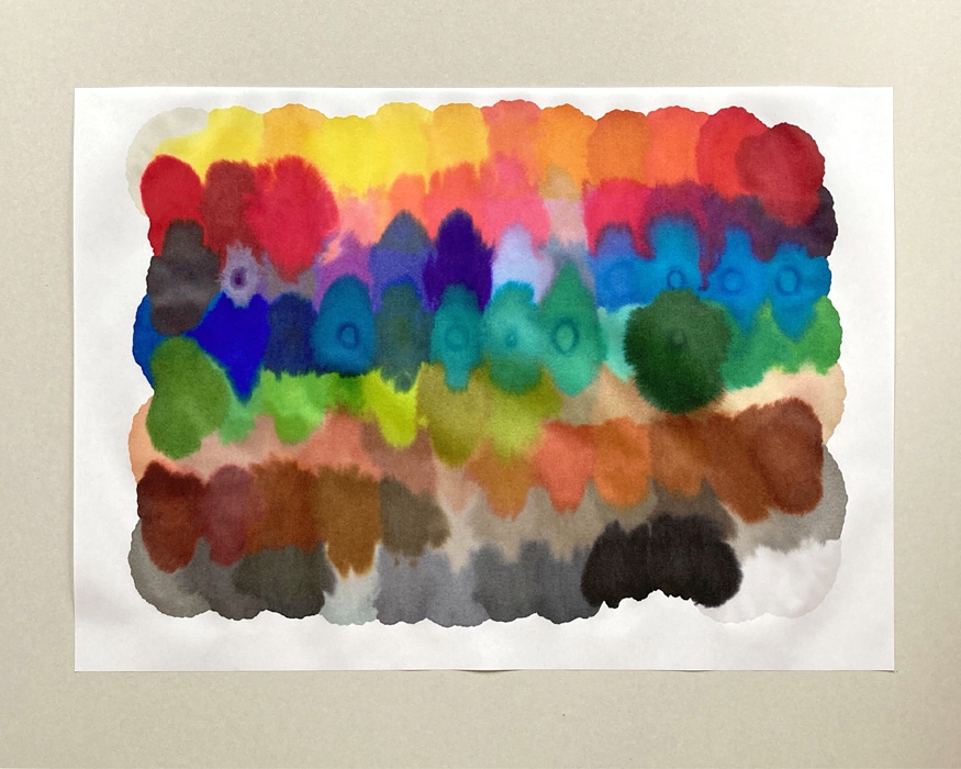 A new edition of 25 ‘unique’ prints made using the Winsor & Newton ProMarker Extended Collection of 96 colours arranged in the manufactures chart. The marker pens were left standing upright in a custom jig, with their nibs resting on the top layer of a stack of A2 paper for 96 hours. Slowly the ink seeped through 25 sheets creating an edition of related prints, each unique. Signed and numbered. Assigned in sequence.