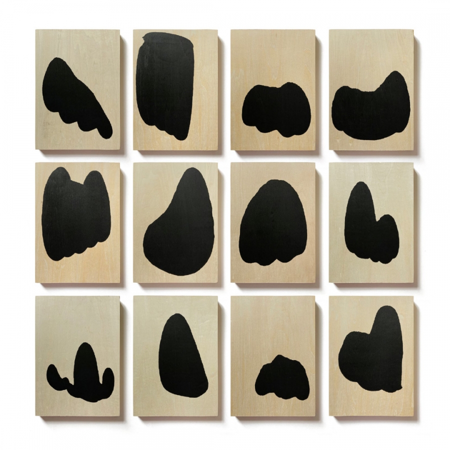 Rolling Pin Painting (black marks) acrylic paint, A4 wood panel x 12, final dimensions (including grid gaps) 900mm x 931mm