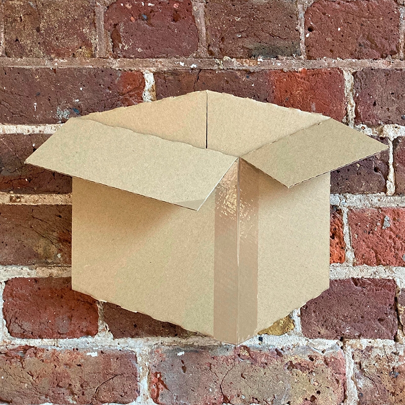 Two dimensional cardboard net folded and secured with packing tape, forming a trompe l’oeil representation of a three dimensional cardboard box.