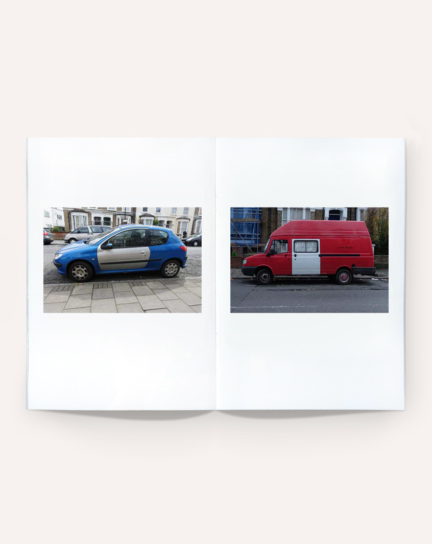 Focusing on auto repairs where an identical part from another vehicle of the same model, but of a different color, is substituted, these photographs focus on a practice in plain sight, on economic and transparent fixes. Recognizing a connection with art conservation—where repairs are meant to be visible rather than camouflaged—as well as with the Japanese art form of kintsugi, where pottery repairs are illuminated rather than hidden. Are these repaired vehicles richer, more valuable and better as a result of accident and repair?