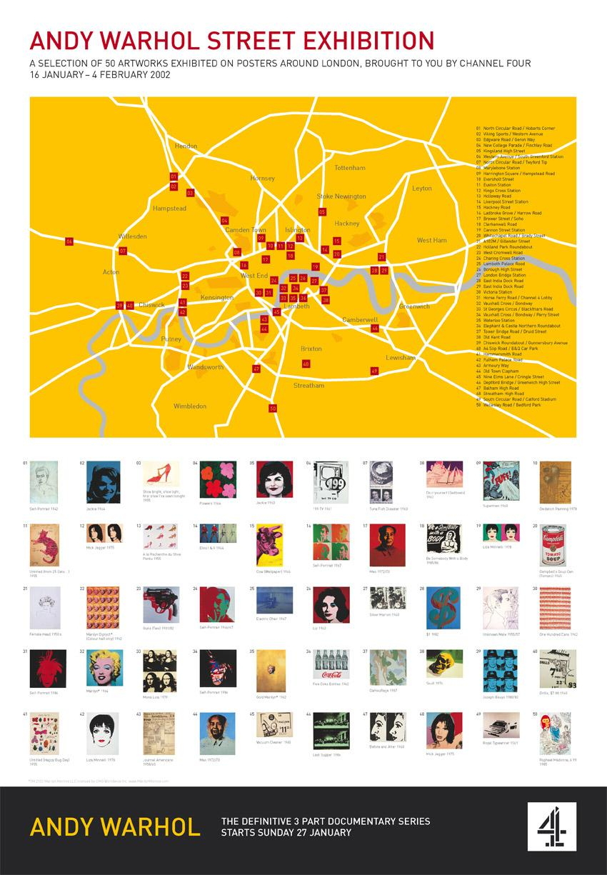 To promote a three-part documentary about Andy Warhol, each of the fifty billboards displayed a different artwork of Warhol’s, forming a street exhibition. An exhibition guide was inserted in newspapers and Time Out magazine, providing the locations of all the billboards in London.