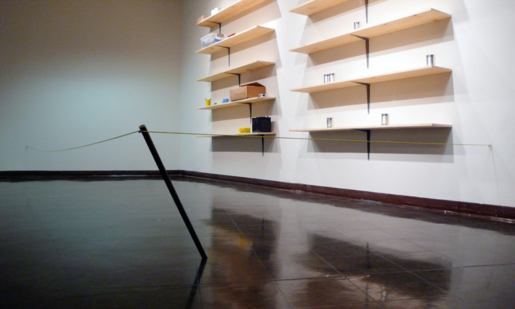 This work was produced in response to a need to develop a physical barrier to prevent viewers at Catherine J. Smith Gallery from getting too close to the gallery wall and thus disturbing the fragile equilibrium of the Do Not Touch (Counterbalanced Shelves) and Do Not Touch (Counterbalanced Shelves Centered). A cord (attached to one wall by an eye-hook) was threaded through a metal bar (leaning diagonally from the corner of the gallery) to arrive at an eye-hook on an adjacent wall. Pulled taut into an L-shaped form by the weight of the tilted bar, the cord, in turn keeps the bar from falling and, in the process, hinders viewers from toppling the contents on the two sets of shelves. A precariously balanced object protects other precariously balanced objects. Richard Torchia