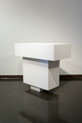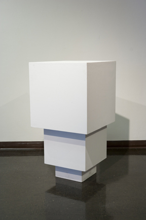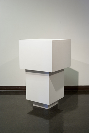 These works enact a number of subtle physical reversals of use and thought that are characteristic of Eatock's practice. First among these is the act of creating sculpture out of plinths designed to display sculpture. The smallest “box” at the bottom of each stack is actually all the viewer is able to see of the tallest, narrowest pedestal, on top of which two other pedestals are suspended. The illusion of stacking—and the attendant lateral, horizontal freedom of movement one assumes with this activity—is replaced by a sense of hanging or draping. The resulting abstract figures speak the language of modernist abstraction manifest in the constructivism of El Lissitzky and Kazimir Malevich. They also reference the the cantilevered forms of Marcel Breuer’s Whitney Museum as well as the Kazuyo Sejima and Ryue Nishizawa/SANAA’s design for The New Museum. Richard Torchia