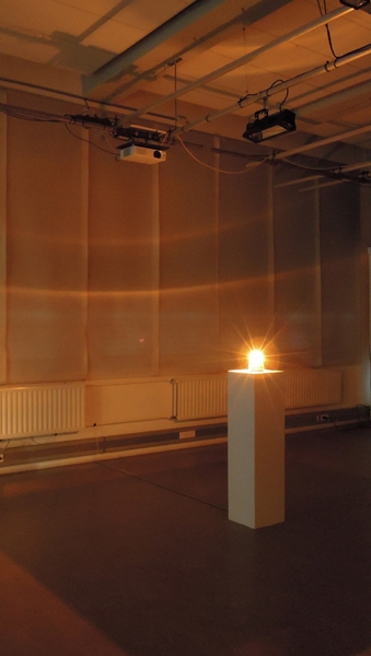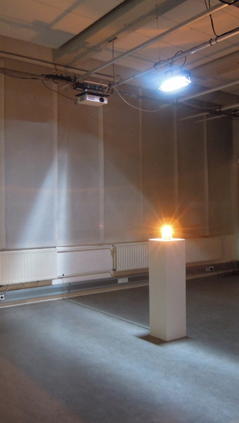 Eclipse apocalypse syncopation rotation blink on off orbit revolution. An instillation consisting of two different light sources: 1500W adjustable strobe light; orange warning beacon. The flash frequency of the strobe light is adjusted to match the rotational speed of the warning beacon. The strobe produces pulsating sharp white flashes, the warning beacon warm orange circular obits. The two fall in and out of sync forming perfect unison and disjointed rhythms, colouring the environment of the gallery.