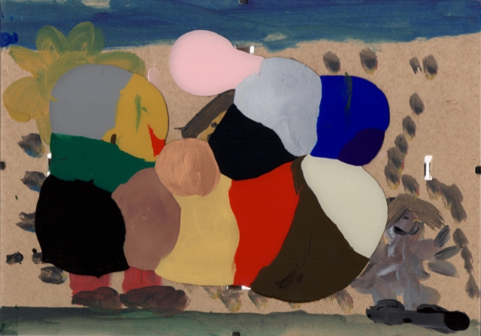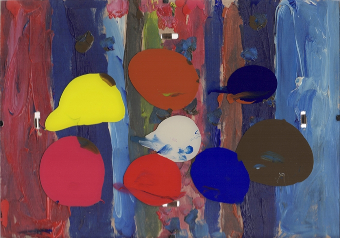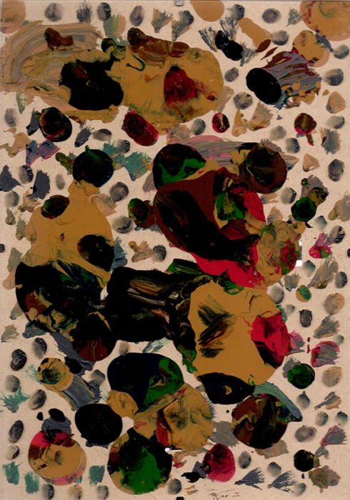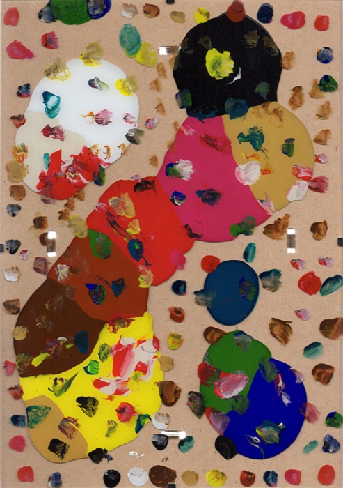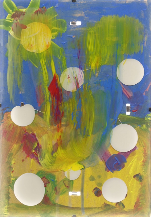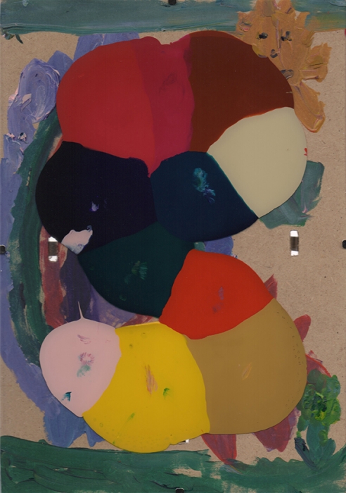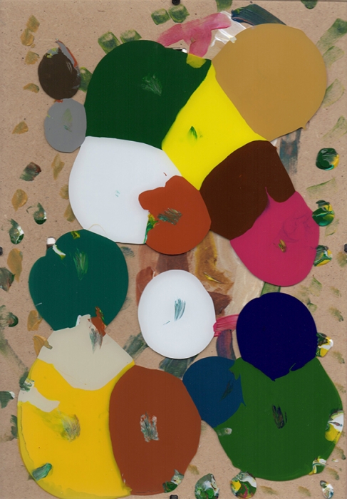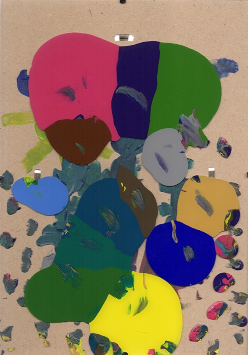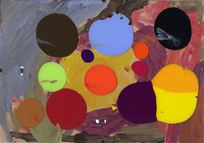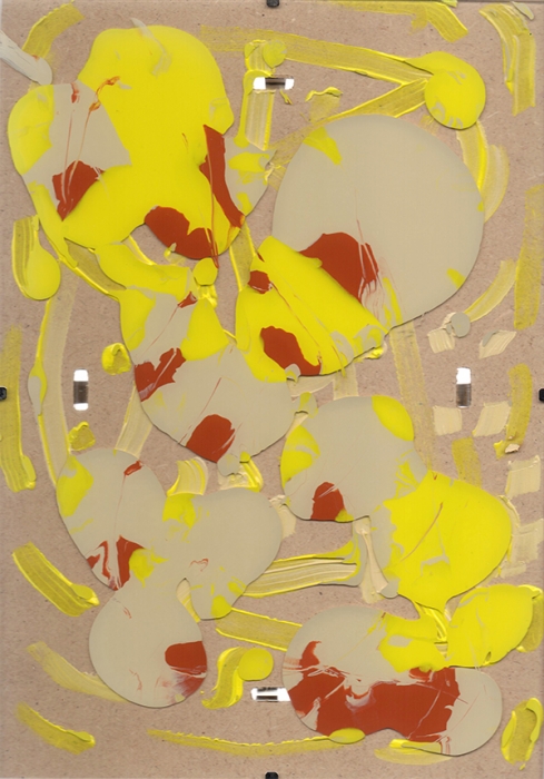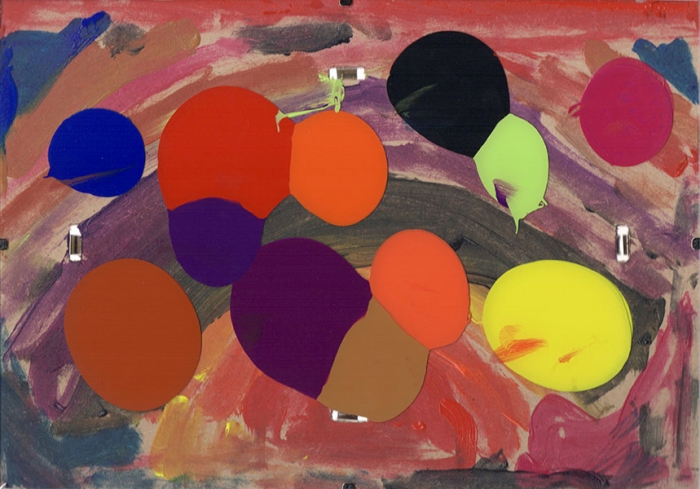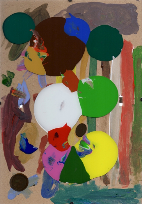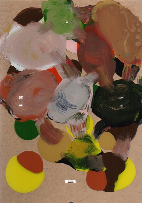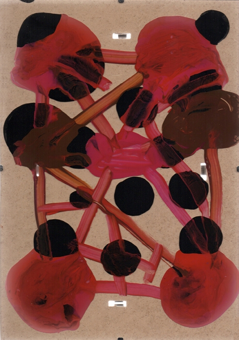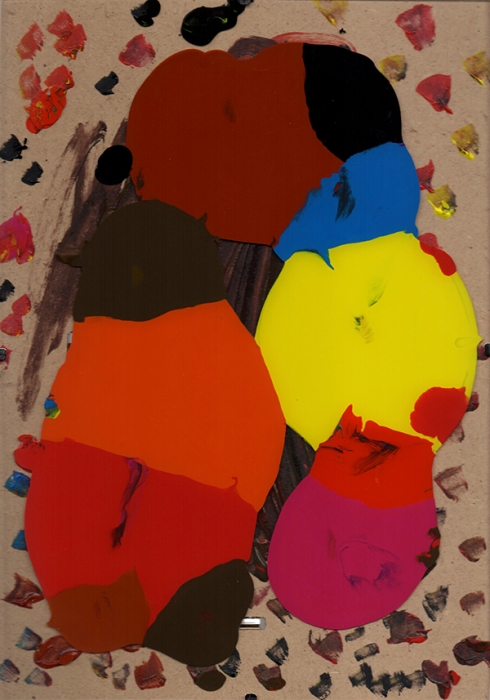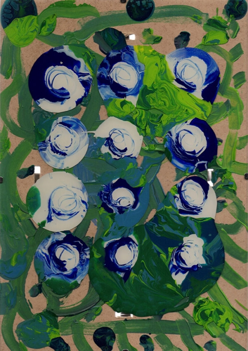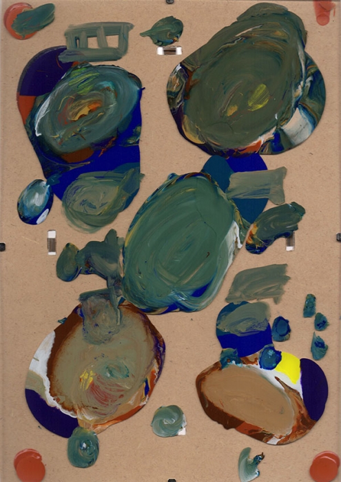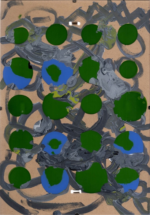 Home school collaboration made with my daughter, Danielle in home studio isolation. A4 clip frame with acrylic paint between glass and MDF backing board. The paint was applied to glass and used as a colour mixing pallet, a picture was painted on the MDF backing board. The two where placed together forming a composition effected by the weight of the glass and the pressure exerted by the frames clips, spreading and connecting the different colours between the two surfaces.